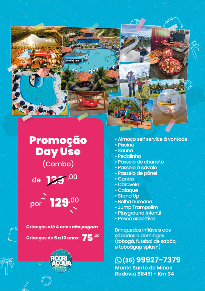 • Todas as atrações: Pedalinho, Passeio de charrete, Passeio a cavalo, Passeio de pônei, Passeio de bicicletas, canoa, caravela, Caiaque, Stand Up Paddle, bolha humana, Jump trampolim, Playground infantil e Pesca esportiva.